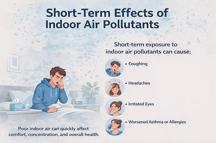 Short-term exposure to indoor air pollutants can lead to coughing, headaches, irritated eyes, and worsen asthma or allergy symptoms, affecting comfort, concentration, and overall health in just a short period.